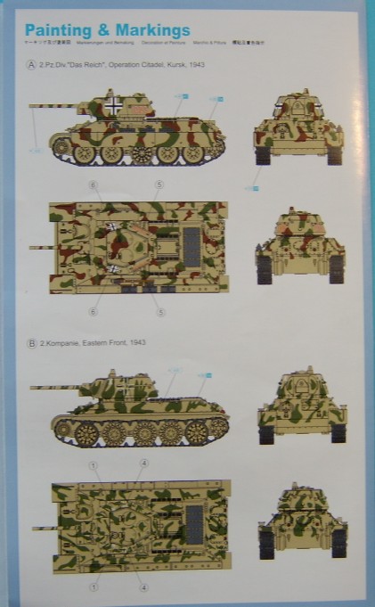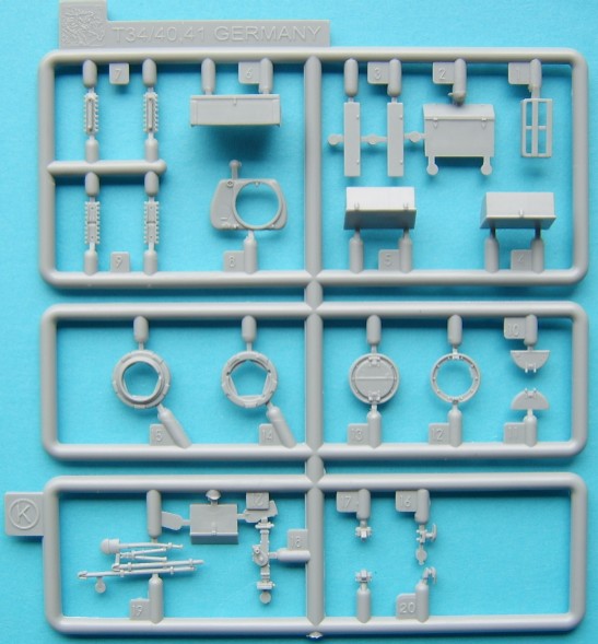 Yet another T-34 from Dragon although funnily not a lot has been said about this one on various forums, probably because nobody could find anything to moan at. The kit uses the same hull and turret as the 42 version. Following the comments about the 42 hull dragon have corrected the hull in this model to a more common version. The kit is basically the Model 42 with added parts for German use, in fact 4 different vehicles can be built, shame that they don't supply 4 hulls to do it with, in fact only 4 options are given in the instructions but other versions can be built from the parts as will be shown The kit uses the lower hull supplied in all the T-34 kits. The kit is essentially the T34 model 42 with hexagonal turret with the exception that the hull has been modified to a more common version. The kit is broken down exactly as in the T-34 model 42 As with the 42 version two turret roofs are supplied, I am still perplexed by the rood on sprue D I have still not found and 42 version with the sights mounted on the RHS Now we come to the best bit, Sprue K contains all the part required for the German versions, in fact it also contains parts to make a Model 41 Beute panzer Included on the sprue are the bins used on the 42/43 model including the jerrycan frame the side bin for the 41 version, a new hatch for the 41 model as well as a PzIII cupola with the option of open or closed hatches. Also included are the notek lights Jack and frame with tools. Contary to what has been said in various reviews in Magazines 4 different road wheel types are provided mainly the all steel and dished, also included are 4 early pattern webbed wheel and 2 late pattern webbed wheels. The wheels althoguh beautifully moulded have one big shortfall, the hole are all closed making for a lot of up. I still ca not understand why Dragon can not do open holes, I can see no logical reason even using slide moulds as to why they are not open?? oh well back to drilling. The tracks are the same and of the correct pattern The usual metal tow rope the PE is a fairly comprehensive set providing the side skirts and one of the stowage boxes in brass, also included is a new fan /radiator cover this time with bolt detail, the louvres for under this are also provided and can be positioned. The PE set also includes all the engine deck intakes, handles for the stowage boxes, details for aroung the tow hooks and a new Notek mounting plate, this set is better than some of the aftermarket sets you can buy. If like me you have the Armo barrels lying round, with a slight modification to the turret mounting they fit perfectly and enhance an already good kit. Markings are provided for 4 vehicles in german service each vehicle is shown in the instructions as a different option and a small table is provided to show what fits on which version. This must be the most complete T-34 kit in this scale, in fact I know it is, the options provided supplies lots of parts for the spares box. Nice to see that Dragon have changed the hull for the more common type, although people will still moan about the DS tracks (which can always be replaced with the UM ones which I find the best Plastic tracks) and although these kit (here in the UK at least) are slightly more expensive than others, add the cost of buying a kit and a set of PE together and they work out very cost effective.