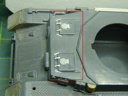 | Lifting-hooks and bolts, again made from scratch, are placed at each front side of the hull, see photo. | |