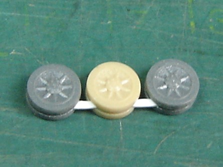 side of the hull. I made this rack by cutting a small length of thin copper sheet; the third, light-ochre, roadwheel comes from another Pz IV Esci kit. The three roadwheels are held together with a bit of plastic strip glued between them to help their alignment on the rack. |
