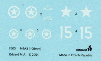 The turret is essentially the same as the turret included in the Extratech M4 kit, but with some minor changes. First of all, it comes with the 105mm gun and mount, which are nicely done, though not as sharply detailed as some of the resin versions I have seen of this gun mount. The only change to the main turret piece itself is the addition of the loader's hatch, which unfortunately is molded closed. It is difficult to tell at this scale whether or not the right turret cheek has had its armor thickened, but if it had been, there should be a notch at the bottom of the thickened portion around the turret ring. That should be easy to add. The gunner's periscope should have an armored cover on it, and etched brush guards should have been provided for the loader's and commander's periscopes as well. The glaring deficiency of this turret is that it is a low-bustle turret. This was correct for the M4 early kit, but is not correct for Shermans with the 47° large-hatch hulls. It should have been a high-bustle turret, and I don't think it would be very easy to convert this on your own, unless you are skilled at scratch-building (which I know that many of you are). Perhaps some aftermarket firm will provide us with a nice high-bustle replacement turret (with open loader's hatch please). Markings are included for only two versions, both US. Being single color, registration is luckily not a problem. Otherwise, they are very finely printed with sharp edges, and opaque ink.