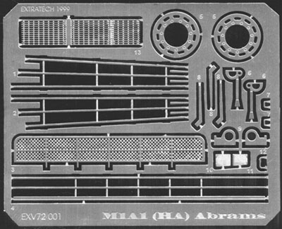 This is one of the few brass sets I have seen in which all the parts are useful. The sprocket wheel covers are optional, as I read that very few M1A1 Abrams used these "training wheels" as the crews called them. Obviously, this is a much simpler set than the PART offering, but the bustle racks in this set will be much easier to assemble, and of course, this set is much cheaper. Very good instructions are included. The set is designed for the Revell kit, but likely could be used for the ESCI M1A1 as well. Note that the bustle racks were not used on the M1 Abrams, so the majority of this set would not be useful for M1 kits.