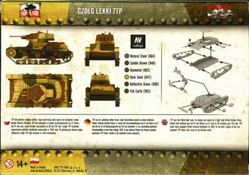 Overview and assembly The kit contains two sprues, with 21 parts. A basic small assembly instruction is given on the back side of the box, which is sufficient. It also comes with a thin booklet on the 7TP and the Polish Campaign, which is in Polish only. (Actually the kit is a "bonus" to the periodical booklet.) On the box you'll find a painting scheme with the corresponding Vallejo paint call outs, also repeated in the booklet. The model is a