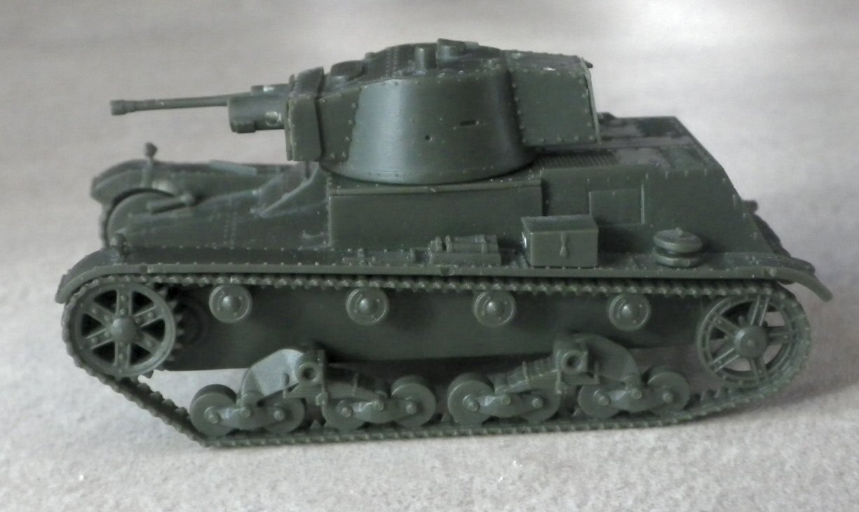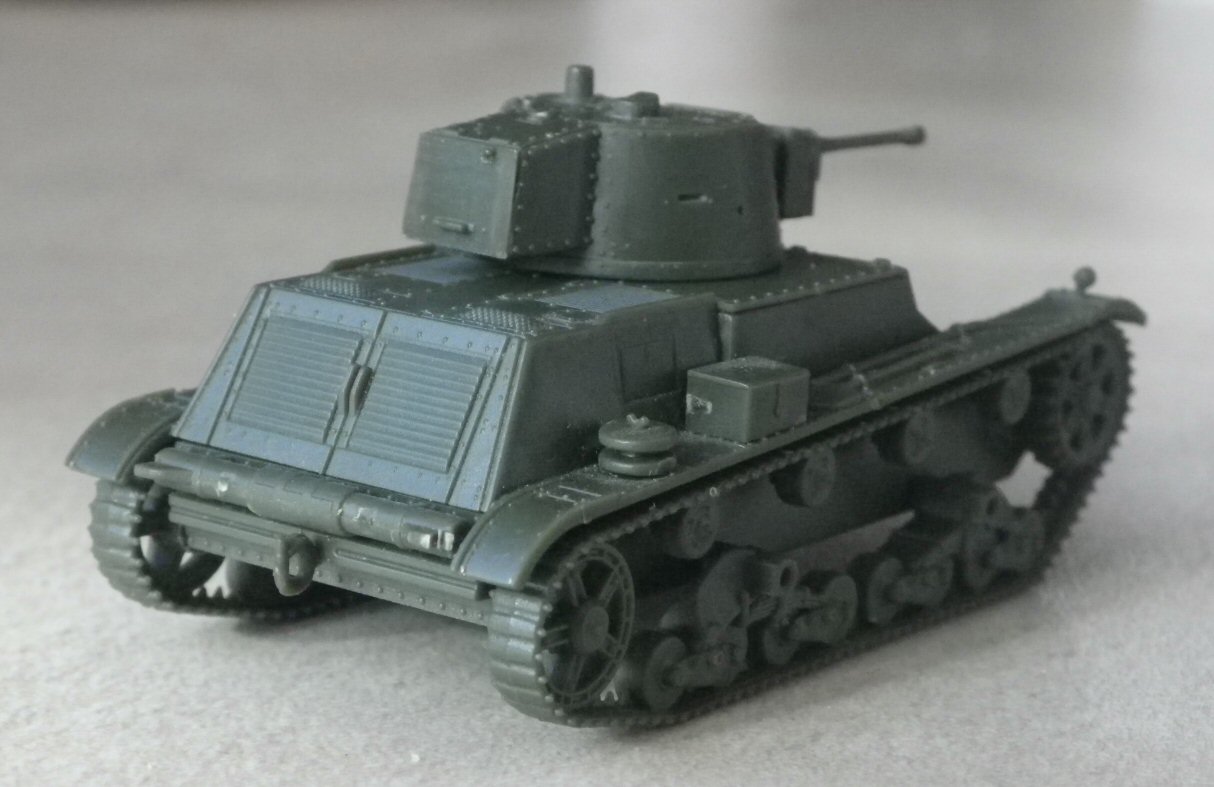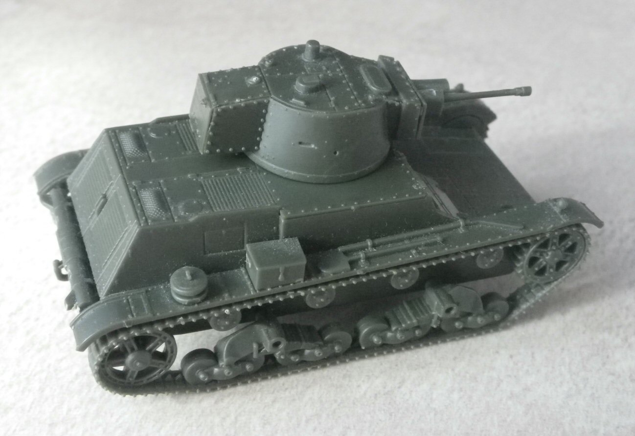 The 7TP was the best Polish tank in the 1939 campaign, and one of the symbols of the pre-war Polish Army. The ultimate and most numerous variant was the single-turret version, with 37 mm Bofors gun. You can read more about its development and combat use on my page. First to Fight's kit of the single-turret 7TP appeared in 2015. It should be noted that this kit represents the less numerous early production single-turret tank, differing from the main series in a low-mounted muffler and horizontal shutters in the rear plate instead of armoured doors. (It shared the hull with the initial twin-turret version.) Such decision is justified by the desire of parts' unification with a twin-turret model, but the result is a relatively rare version (probably no more, than 18 tanks). Of course, the difference is negligible, if you need just a generic single-turret 7TP.
