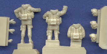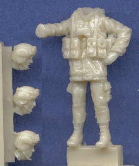 The sculpting is fantastic, and with the exception of a single air bubble marring one of the trooper's jacket cuffs, the casting is first rate as well. They are dressed with tanker's helmet, heavy jacket, microphones, and full load of personal equipment. I currently have no references on the uniform of Israeli tank crewmen, so I do not know if this heavy jacket is a foul weather item, or part of the normal kit of a tank crewman. Here is a close-up of the standing figure and the heads, so that you can better appreciate the high quality of the sculpting. Keep in mind that this guy is only 21mm tall!