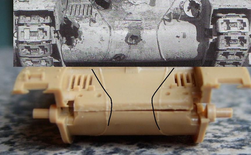 Once the two hull halves are put together it is noticeable that the weld seams on the front nose of the tank are not correct as can be seen from the comparison picture, the black lines are roughly where the weld beads should run. Also noticeable on this picture is that the two notches in the nose are missing on the real tank, this indicates that it is a Mk III, as can be seen the two stowage boxes still have the louvered lids, which possibly means that the metal plates were a field Mod and varies from unit to unit or even vehicle to vehicle.