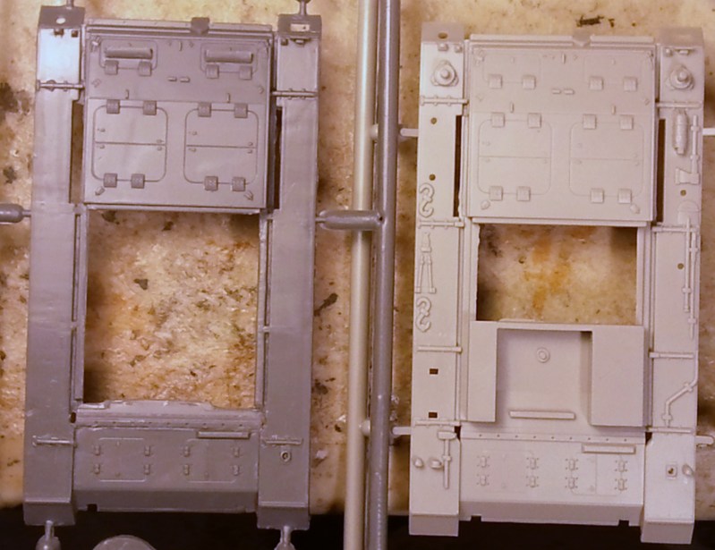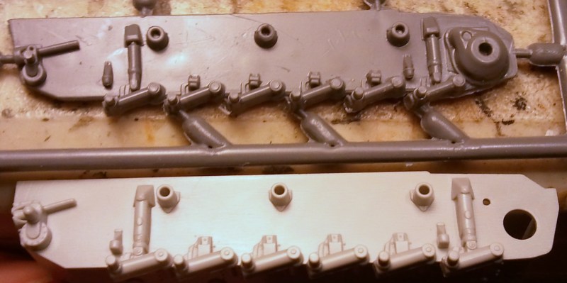 I have been on a bit of a StuIG 33 kick lately. I have bought two of the Attack 33b kits and I recently purchased the MW kit. I have also purchased an extra ACE sIG 33 gun to use in a kitbash. My brain has been thinking of ways to kitbash this vehicle into the best possible model. I have been inspired by Doug's article on the new MW kit and his original article on the options for this particular tank. http://www.onthewaymodels.com/reviews/MW/StuIG33_prev.htm http://www.onthewaymodels.com/articles/StuIG33compare.htm Both of these articles list the strengths and weeknesses of each model available. In my mind I determined to cross the best parts of the kits from Attack, MW and ACE gun. The MW kit has many good parts but the wheels leave a lot to be desired and as Doug says, they are "extremely poor." Here is a pic from Doug's review. I decided to replace the wheels with ones from a Trumpeter Stug III C/D kit - because they are better and I picked up a couple of them cheap on E-Bay. But then I started thinking, if I am using the Trumpeter wheels, why not use the Trumpeter suspension and upper deck? So I get out the two to compare them and to see if the MW fighting compartment would fit on the Trumpeter deck. Well, I found out that it would fit because IT IS THE EXACT SAME KIT!. The MW model is a casting of the Trumpeter kit. Both the upper deck and suspension are exact replications with only slight moderations and deletions on the MW offering. The evidence - MW on the left. As you can see, the MW kits has had the fender detail removed to allow the larger fighting compartment to fit. You can even see the places on the fender where parts were removed and sanded off. But it matches hinge for hinge, bolt for bolt. Even the crappy little bump tail lights and reflecters are the same. The suspension is also an exact copy. MW on the left. (Ed. note: it seems these parts are copies of the Revell Panzer III/StuG IIII kits, rather than of Trumpeter's, which means that some fit issues will arise.) Military Wheels does not have slide mold technology so they have broken up the suspension bucket into three parts (like in the ESCI olden days) but it is the same kit. But again it matches bolt for bolt, althought the detail on the MW kit is slightly "softer" as we would expect a second generation kit to be. MW on the top. Again only difference in the addition of the "hub" for the drive sprocket and some softness of detail. (Ed. note: again it seems these parts are copies of the Revell Panzer III/StuG IIII kits, rather than of Trumpeter's, which means that some fit issues will arise.) So bottom line is any kitbash with the Trumpeter kit should be very easy to say the least. I just wish MW would have "Bootlegged" the Trumpeter wheels, then some of this kitbashing would not be necessary. |