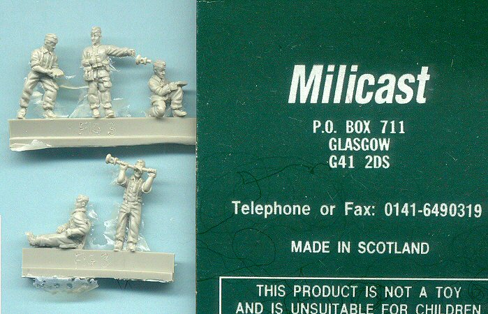| This small scale figure set comprises five German uniformed WW2 soldiers posed to serve a 2-cm Flak 30 or Flak 38 AA gun. The gun type I am basing on the distinctive 2-cm ammunition clips being held by two of the figures. We have a sitting gunner figure, commander, two loaders, and a standing figure with a rangefinder. The figures are packaged in a small plastic bag with no padding, and no painting guide. We can see in the photo of the parts that one end of the rangefinder broke off during handling and shipment to me. I have five pale green cast resin figures on two pour plugs with no separate heads or arms. Detail on the figures I feel is good though the proportions do not appear quite right, the arms appear too big and the legs too short. Considering the poor proportions compared to Milicast's other figures sets, and low set number of "3", I suspect this is an early release from Milicast, perhaps not. Though sold as 1/76 I believe these are passable with 1/72-scale vehicles. These