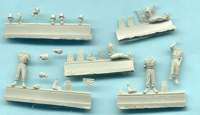 | This figure set consists of five WW2 era German Flak crew figures, cast in pale green resin. There are 28 parts on five pour plugs in my small plastic bag which includes three standing and two sitting torsos, eight heads, and seven clips of 40-mms Bofors anti-aircraft gun ammunition. The figures are sold as 1/76-scale but work quite well with 1/72-scale vehicles. Casting quality looks. The figures come in small plastic bag and no padding, such as bubble wrap to protect the resin parts which leads to occasional broken parts or parts separated off the pour plugs. I know we typically think of the 40-mm Bofors gun as an Allied AA gun but many were used by the Germans as the 4-cm Flak 28, as well as produced and used by the Hungarian Army. These figures could perhaps be used with the Airfix Bofors kit, one of the German Schnellboot (S-Boot) torpedo boat kits, or perhaps the PST Models M1939 37-mm AA gun kit (as a German 3.7-cm Flak M39(r)). I am sure it could be easily used in other German artillery kits as well. The figures are in summer uniform and low boots, some with shirt sleeves rolled up. With the set we have a choice of helmeted heads or with soft, garrison caps. Oddly I have five torsos but two sets of four heads, so we'll have to have a mix of helmeted and capped heads. Of course, I could have a figure set with two missing, lost heads; it would not be the first time I have lost my head? The figures look well proportioned to me and with good crisp detail and reasonably detailed faces. There are no assembly instructions for the myriad of arms and heads, but an experienced and creative modeler will have little trouble posing the limbs to their particular setting. Clean the casting lubricant and dirt off the parts first with warm water and mild detergent. Check your references for uniform colors. References http://en.wikipedia.org/wiki/Bofors_40_mm_gun LUFTWAFFE FIELD DIVISIONS 1941-45, Osprey Military Men-At-Arms Series 229, (1990) ISBN1 85532 100 9 THE GERMAN ARMY 1939-45 (3) EASTERN FRONT 1941-43, Osprey Military Men-At-Arms Series 326, (1999) ISBN 1 85532 795 3 THE GERMAN