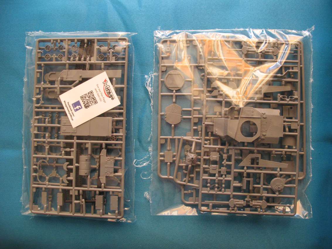 The M3 Medium Tank with welded hull in combination with the CDL (Canal Defense Light) turret is another variant of the M3 Medium tank. The lower hull and suspension sprues in the box are identical to all other released variants with the welded upper hull. The only difference being the new CDL turret, which is well done. However, for some unknown reason, this kit is packed in a much bigger box then the standard "Mirage" format. The Mirage