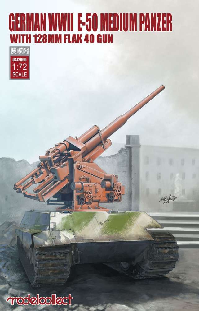 Some history It is not a shame if you have never heard of the German E-50 tank with the tower replaced by an 128 mm Flak 40. This armoured fighting vehicle is a mere creation of the Chinese modelling company Modelcollect. It is not a historical vehicle, but a so called ‘paper panzer’. The only historical part of the ‘paper panzer’ is the 128 mm Flak 40. The gun was without any doubt one of the best German anti-aircraft guns in WWII. This heavy gun could fire a shell of 26 kg as high as 35.000 feet, where it would burst apart in a deadly cloud of shrapnel. Some sources even state an altitude of 48.500 feet. This was high enough to take even the highest flying allied bombers out of the sky. Production of the Flak 40 started in 1942. By the end of the war 1.125 of these heavy anti-aircraft guns had been produced, of which 34 were double guns for use on specially designed Flaktowers. The Germans also made some attempts to give the 128 mm Flak 40 some mobility. As the power of the Luftwaffe was declining, the need grew for more powerful anti-aircraft guns to protect the Reich against the growing intensity of the allied bombings. In this way the Germans produced a specially designed trailer, but as trailer and gun weighed over 26 tons, this was not a success. In this way, it could have been an idea to put the gun on top of a E-50 hull. The German E-series was an attempt to rationalize tank production. The Germans had so many different types of tanks that logistics and maintenance were a nightmare. Besides, all these tanks and AFV’s were produced in rather small numbers. Under supervision of the Minister of War Production Albert Speer, the Germans took up the plan to simplify all this. The aim was to concentrate on six types of tanks, which would be produced in larger quantities. Each type would use as much of the same parts as the other types, thus simplifying logistics and maintenance. The new tanks would be classified as the E-range, the ‘E’ meaning ‘Einheit’ or ‘Standard’. According to their weight, the E-tanks would be: E-5, E-10, E-25, E-50, E-75 and E-100. The E-50 would have been the successor of the Panther tank. However, the war ended before any of these tanks were produced.
