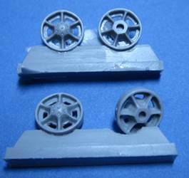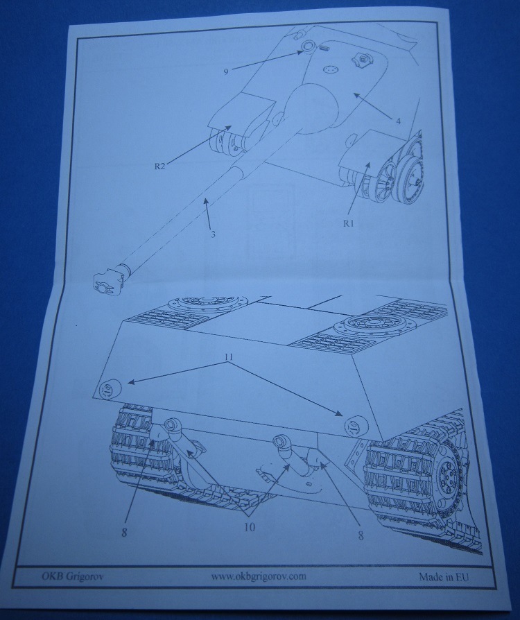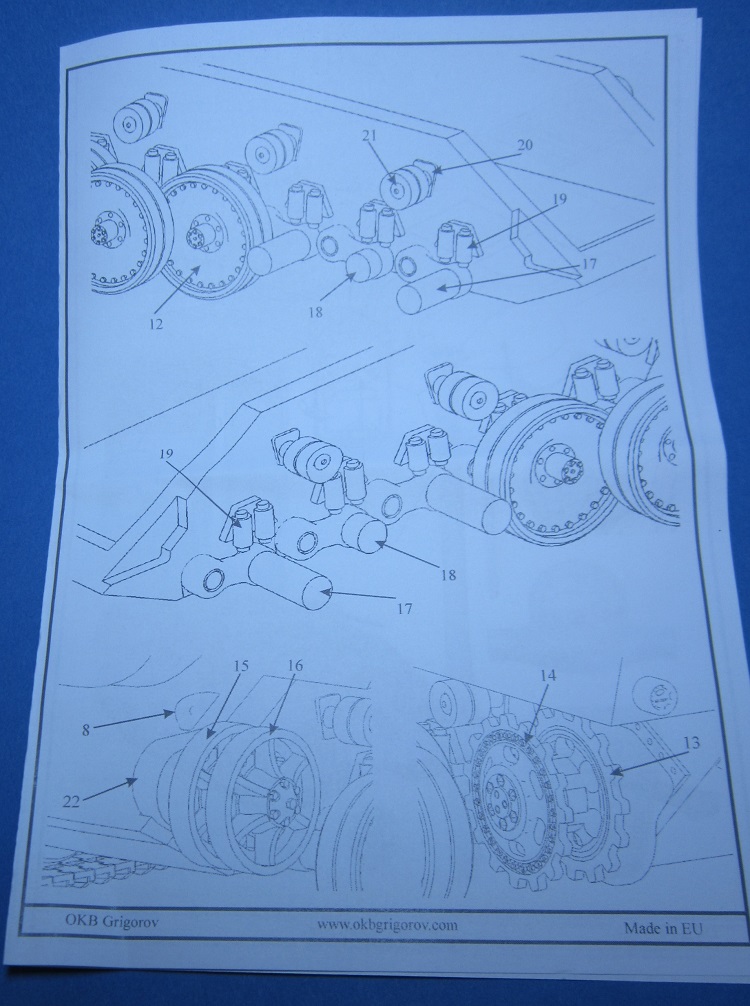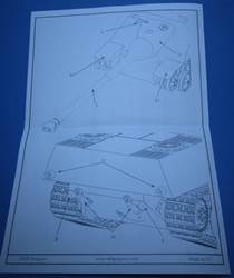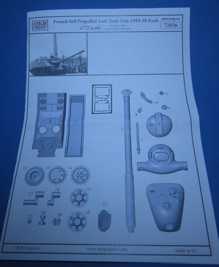 | History, Taken from Wikipedia... Based on the M4 chassis in 1950 a prototype was finished of a heavy tank destroyer in the form of a 120 mm self-propelled gun, the Canon Automoteur AMX 50 Foch, named after Marshal Ferdinand Foch. It was intended to give long range fire support to the medium AMX 50 "100 mm"; after the tank version itself was planned to be armed with a 120 mm gun, the Foch project was abandoned. This is a very popular tank for the World of Tanks game apparently. The model is quite straightforward and has some very nicely cast parts. There is very little flash and what there is can be easily removed with an old toothbrush, the casting blocks are easy to remove and clean up is very easy. What do you get? The box is the standard OKB-Grigorov white box with a printed label on the top... Inside the box... The instruction sheet... The hull castings... These are the main castings in the kit... The pieces fit together absolutely precisely... The bits bag emptied... The running gear, first the torsion bar arms...