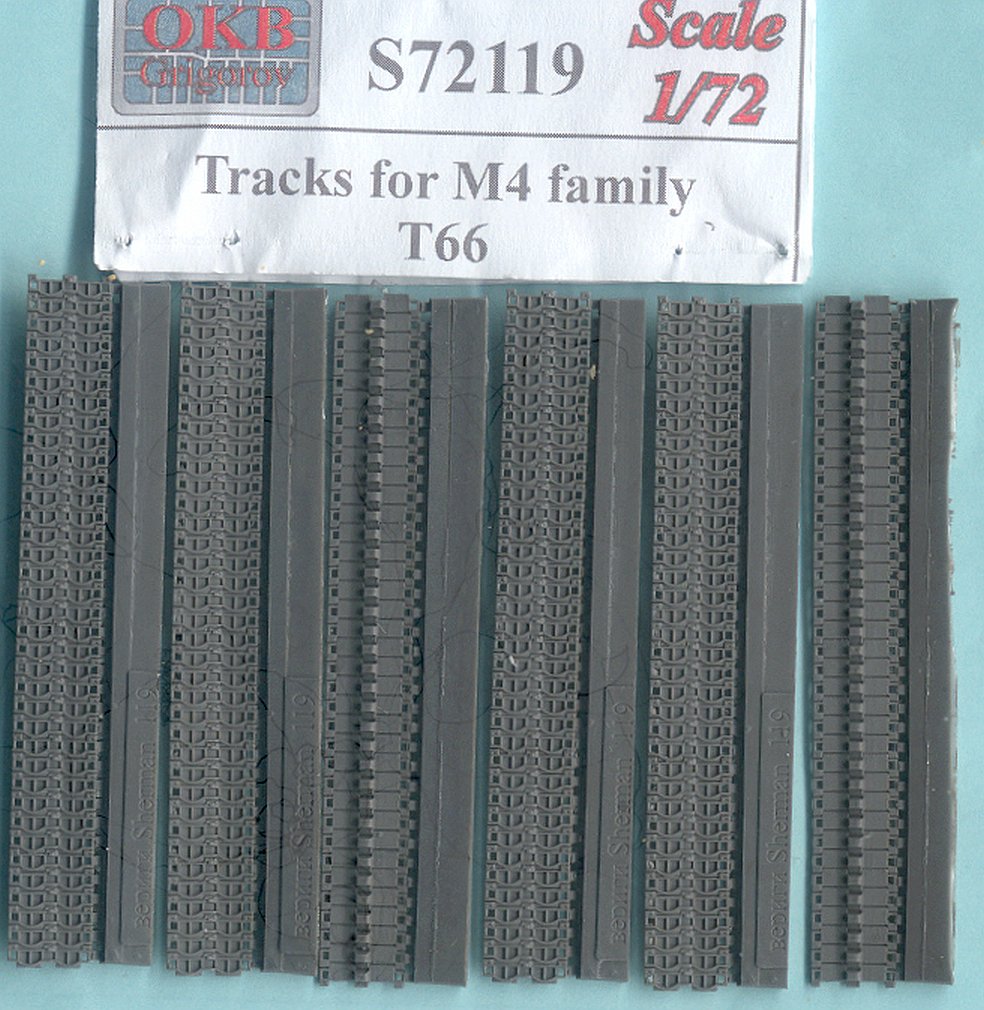 This cast resin track set would not be confused with the OKB Grigorov T66 track Kit #72077, which is an etched brass set of HVSS Sherman track (see preview of this set at