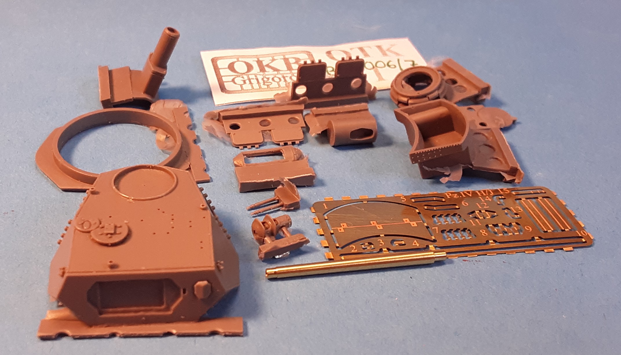 | This kit preview covers an aftermarket turret set to convert a German Panzerkampfwagen IV Ausführung H or Ausführung J into a late Pz IV Ausf. J built in the winter of 1944 through the Spring of 1945. This set replaces and upgrades the complete turret for a 1/72 scale Pz. IV Ausf. H or Ausf. J kit such as the Revell Pz IV H kits 03119 and 4184 and Ausf. J kit 03112, the Dragon kit 7497 and Zvezda kit 5017. Going clockwise, at upper left we have the gun mantlet and recoil housing. Next are two pour plugs holding four turret side doors. At upper right is the late war cupola which I believe is referred to as the Type 3. Rather than lifting on a hinge, the cupola hatch lifts and pivots like the Panther and Tiger cupola hatches. (These cupolas can be bought separately from OKB Grigorov, set 72376.) The cupola has open view ports which is important for modeling the tank in combat. Below the cupola is the turret storage bin with separate brass lid so we can model the bin open. At center bottom are the two MG34 machine gun barrels for the turret and the hull ball mount, and the KwK 40 muzzle brake. The turret, at lower left, is superbly cast with screw detail, weld seam detail, three Pilze jib crane mounts on the roof, and the four lift hooks on the upper side. The cupola and side door opening are covered by a thin sheet of resin that is easily cut out with a sharp blade if we wish to model the hatches open. If we do model the doors and hatches open we better install some detail inside the turret. The gun mount opening is also blanked over by thin resin which we should cut out in order to mount the gun parts.
