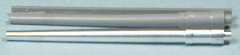 | The kit contains 92 resin parts, 189 photo-etched parts (in two thicknesses) and 4 injection moulded sprues of link and length T97 rubber chevron track links. My kit also contained a turned aluminium 155 mm gun barrel. This is not mentioned the instructions, and a duplicate resin barrel is included. This is handy, since the resin barrel in my kit was slightly warped. To my eye the contours of the metal barrel aren't perfect either - it looks a little too fat in the middle, and the subtle flare at the tip of the barrel doesn't look quite right either. Sorry for the poor photo - I couldn't get my camera to focus on the shiny metal barrel! | |