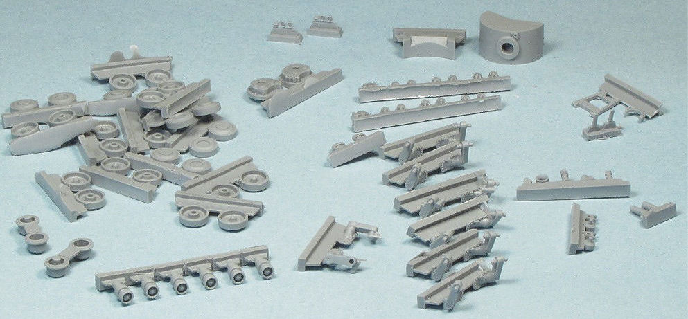 | All the suspension components are moulded separately from the hull - so take care to keep track of the three different types of suspension arms. Each drive sprocket is made up of 4 photo etched and 2 resin parts. My kit was missing a couple of shock absorber parts, but it should be easy enough to scratchbuilt replacements. | |