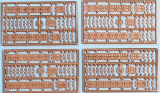 For the tracks, OKB Grigorov provide 4 sprues of their T97 track links. This is a bit of an issue. The M53 and M55 were based on the automotive components of the M46/M47 tanks. They were equipped with the T84E1 rubber chevron tracks. The T84E1 tracks were the ultimate evolution of the Sherman HVSS tracks, and kept the same dimensions as the HVSS track - 23 inches wide and a 6 inch track pitch. The T97 tracks were introduced with the M48, and were substantially wider at 28 inches and also increased in pitch to 6.94 inches. In scale, that means that a T97 track link is 1.8 mm wider than a T84E1 track link. The OKB tracks are also slightly over scale, so the error is closer to 2.2 mm. Aside from the width difference, the inside face of the T84 tracks is essentially plain, while the T97 tracks have a partial width rubber pad, and exposed metal on the outer sections. The OKB tracks faithfully reproduce this detail on the T97 tracks. As noted in this review on OTW, the injection moulded tracks suffer from sink marks on every link. |