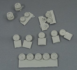 The tracks (link and length) and roadwheels are slightly adapted copies of the Revell Marder APC; see green parts on the assembly sheet below. They are nicely reproduced, but some air bubbles can be seen. The torsion arms are provided as separate parts, which means you can play with the suspension systems to adapt itself to the terrain. But beware, the shock dampers then also need to be adjusted... |