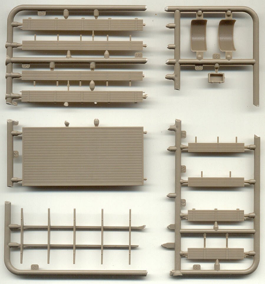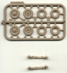 The plastic pieces are the cargo bed sprue (cut into 5 parts to fit the sturdy small box in which the kit comes), a wheel sprue and a couple of