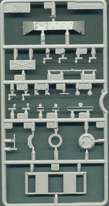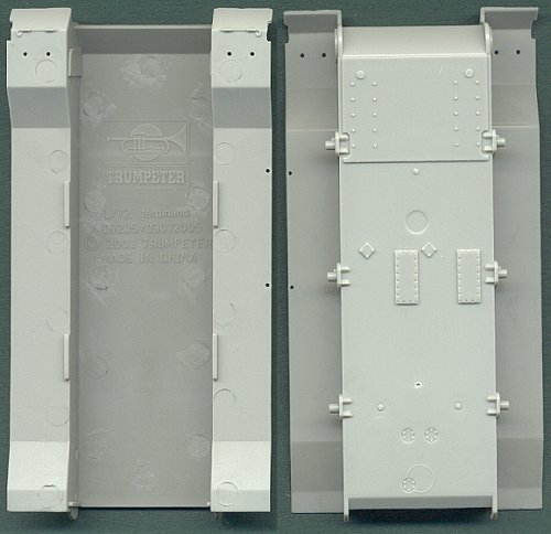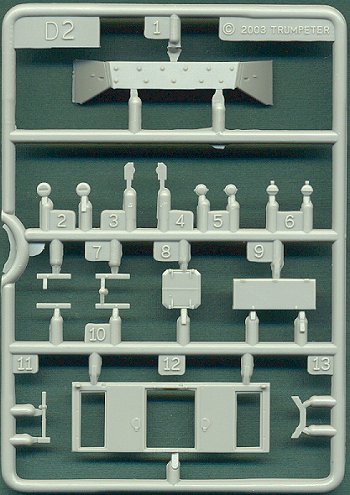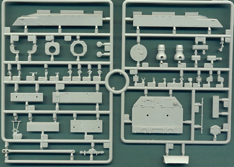 similarity between the two kits. The molding of these kits is first rate. The detail on everything is outstanding, and very delicate. The two kits are perfectly accurate in size, shape and details. The chassis is highly complex, and it allows the modeler to fully articulate the wheels, so as to easily display the vehicle traversing uneven terrain. There are horrible ejection pin marks on the top of the fenders, most of which will be covered by other parts, but not the two front ones, which will need filling. Had there been any tread pattern on the fenders, it would have been lost in this clean-up operation. There are a great many very small parts, so care will be needed when removing them from the sprues. The following sprues are included in both kits: The fighting compartment is highly detailed, with all hatches open (though the hatches themselves are molded as very thick single parts, which will need care in separating).