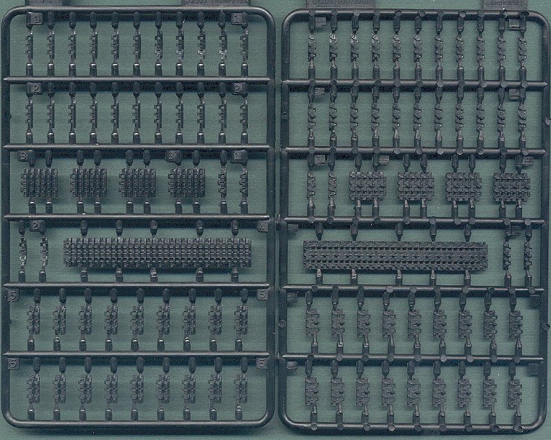 The tracks are molded in link and length hard plastic and are highly detailed. Pictured here are the Ferdinand tracks: Note that the tread patterns for the two kits are subtlely different (Ferdinand on left, Elephant on right):