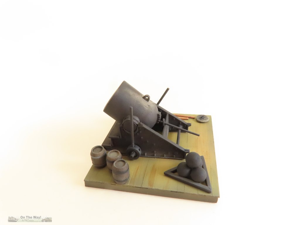 With the trucks tossed I decided to construct a small base to mount the gun, built from plastic strip and square rod. I also added a scratch built triangular cannon ball rack. If you look closely at