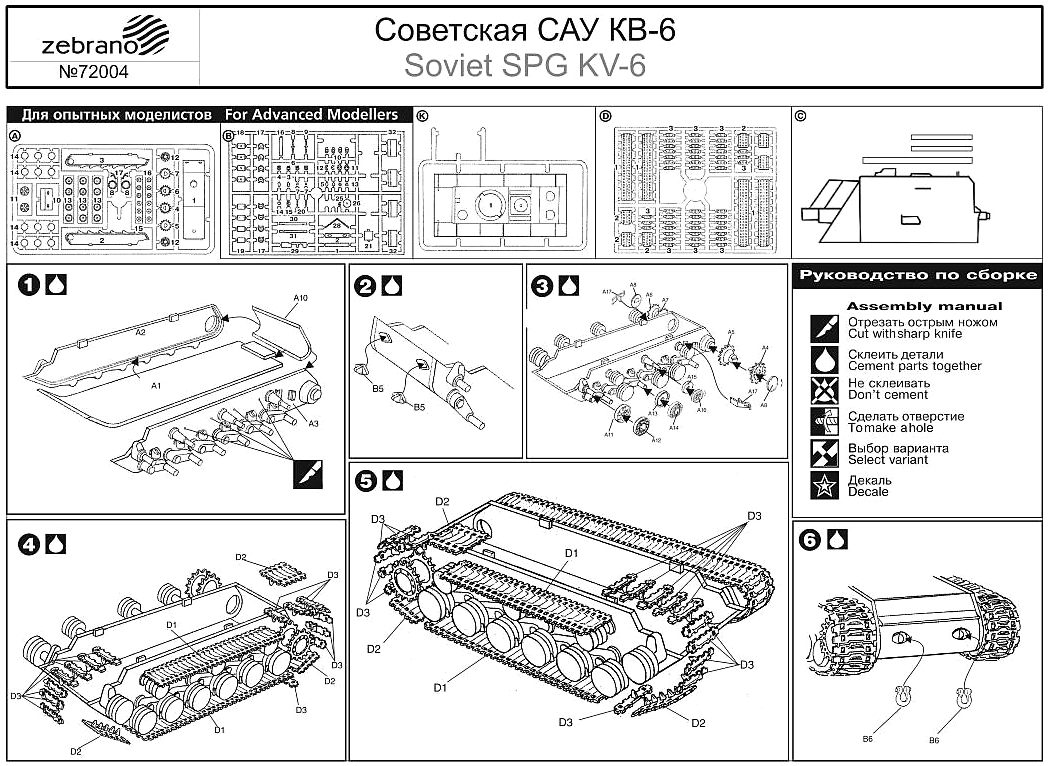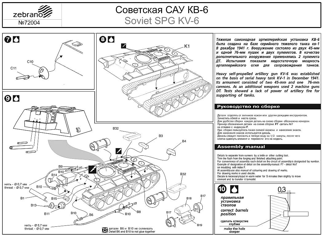 | Introduction: Zebrano is a small 1/72 scale manufacturer from Belorussia, which has released some interesting Russian vehicles from the WW2 era. Not the same vehicles as with many other manufacturers, but more exotic subjects and prototypes of vehicles not earlier released in this scale. Some kits are manufactured in collaboration with other manufacturers using kit parts from brands like PST and UM. The first 4 vehicles were released under the PST label. The later vehicles were released under the "Zebrano" label. These kits include a KV kit from PST or a Gaz truck from UM, with extra resin or brass parts from Zebrano. The company also released some completely new vehicles and figures. History: The KV-7 self-propelled gun was designed in November 1941 on the initiative of the ChKZ design bureau in Chelyabinsk and the UZTM design office in Sverldovske under the overall supervision of J. Kotin. Installation of the weapons by UZTM was supervised by KN Ilin and H. S. Efimov, from ChKZ - GNMoskvin. Senior engineer was LE Sychev. The vehicle was built on the basis of the KV-1 heavy tank with a different gun. The first prototype was made by UZTM in December 1941 and was tested on the shooting range. Final assembly of the machine was carried out by ChKZ in early 1942. It was the first heavy self-propelled gun in the Soviet Union during WWII. Series production was not pursued. Its armament consisted of two 45mm and one 76mm cannon. As additional weapons it used two DT machine guns. Tests showed that the tank lacked in firepower for its intended role. Sources: Hypothetical Combat Service: Content: Dimensions: Instructions and markings: Assembly hints: A highly recommended kit. Congratulations